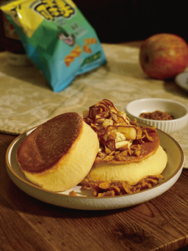 以「米」製成的舒芙蕾鬆餅,精準切中現代人追求無麩質的健康趨勢。此次的「翻轉咖哩飯」,以米舒芙蕾鬆餅取代了米飯與歐姆蛋,淋上由奶霜與咖哩調和而成的溫潤奶霜,酥脆的「海苔口味可樂果」增添口感層次。
