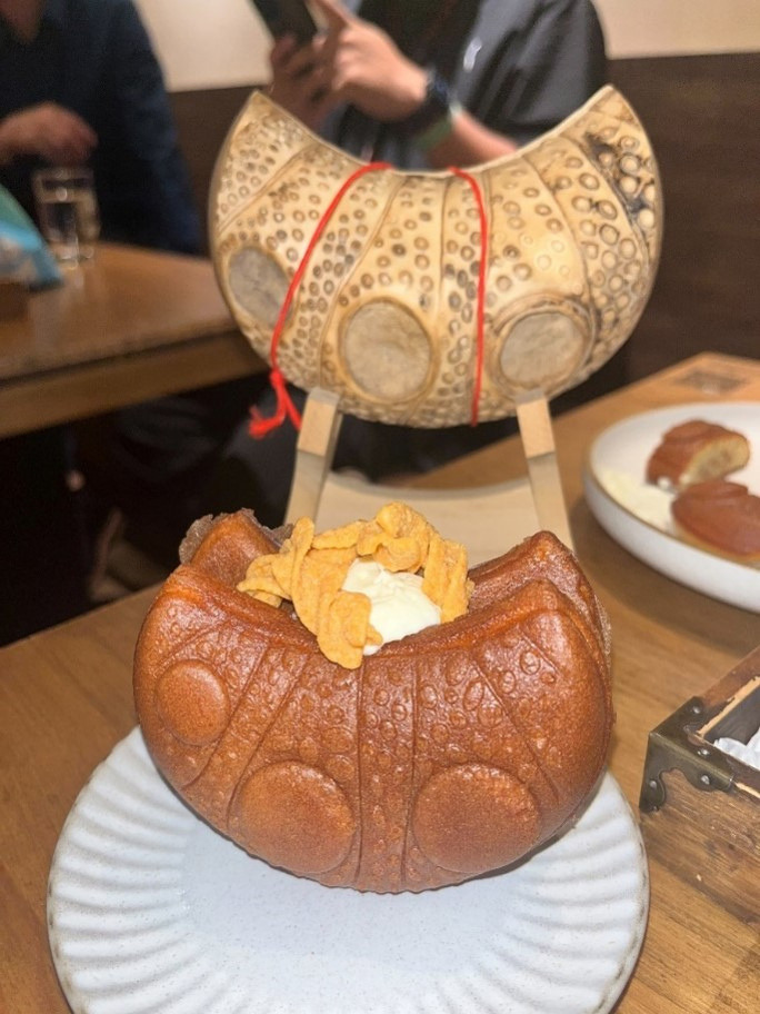這款「竹頭燒」外型直接復刻台灣拜拜時常見的「竹頭筊」,口感類似瑪德蓮般紮實,內餡則是濃郁乳酪醬與原味可樂果的相遇。為了完美還原台灣傳統拜拜文化,上菜時還會附上專屬籤筒讓客人現場抽籤。從視覺、味覺到皆極具深度。