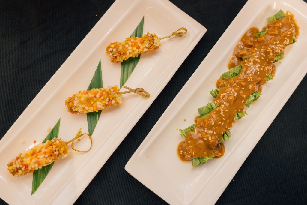 另一道則以清爽的水耕菜搭配香濃芝麻醬,撒上「海苔口味」可樂果。水耕菜爽口多汁,與麻醬的濃郁芝麻香形成鮮明對比,而可樂果的酥脆則讓整體層次更加豐富。