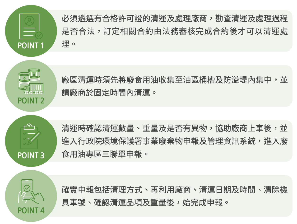 處理回收流程須先將回收廚餘放置固定地點集中管理避免雜亂。並請廠商於固定時間內清運,減少異常氣味產生。清運時確認清運數量及是否有異物,協助廠商上車後,並進入行政院環境保護署事業廢棄物申報及管理資訊系統,進入再利用三聯單申報。確實申報內容包括;清理方式、再利用廠商、清運日期及時間、清除機具車號、確認清運品項及重量後,始完成申報。