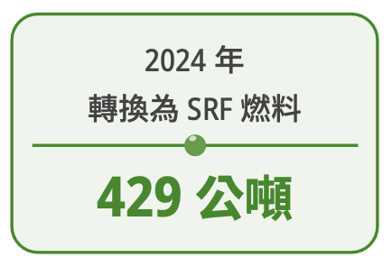 2024 年共轉換約 429 公噸廢塑膠為 SRF 燃料,估計減碳效益約 330 公噸 CO2e,有效提升廢棄物能源利用率與碳排管理績效。