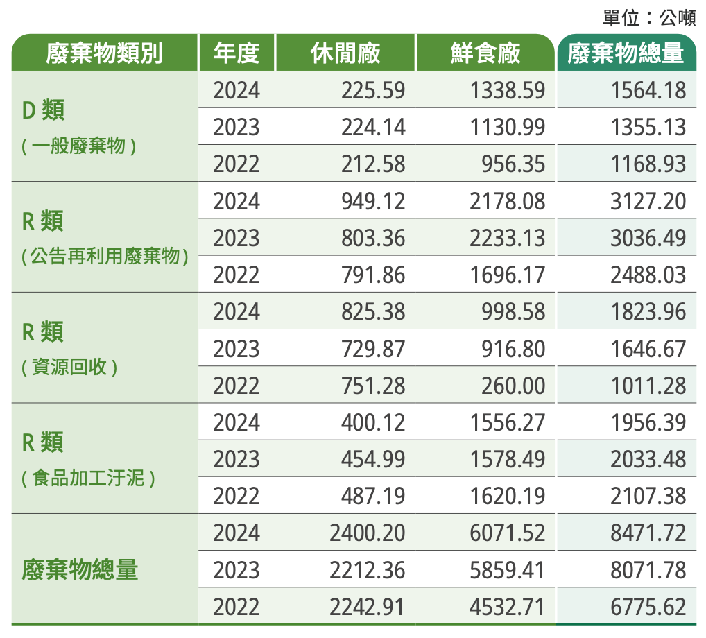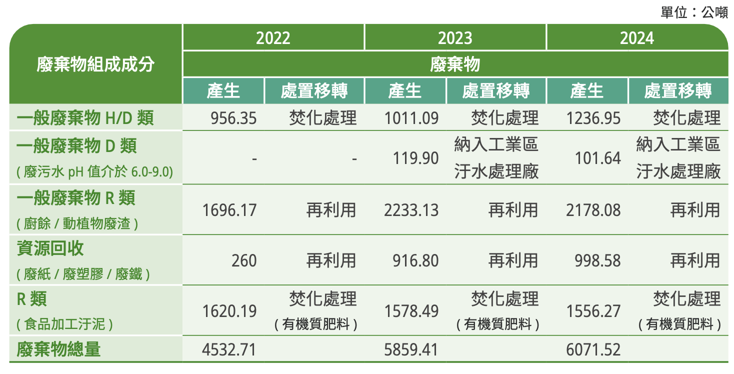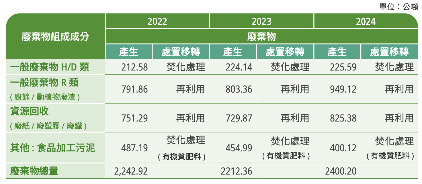 聯華食品包括原物料、產品及廢棄物都有受到規範及管制,廠區對廢棄物的清運處理尤為嚴謹,而廢棄物也可分為一般垃圾、可再利用及可資源回收三類,且聯華於 2024 年無產生有害廢棄物。