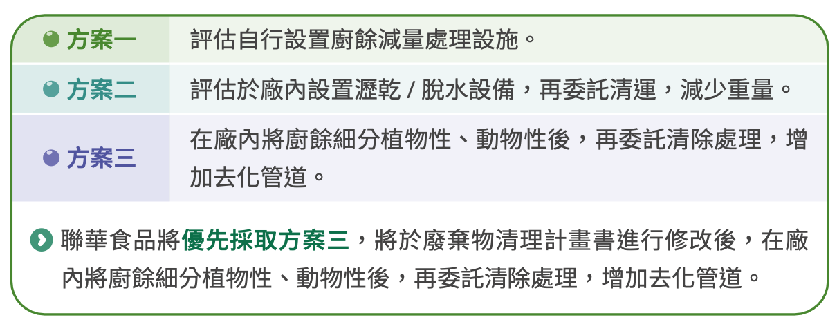 廚餘減量方案:聯華食品針對廚餘減量問題提出相關配套措施,各種可行方案如下:
