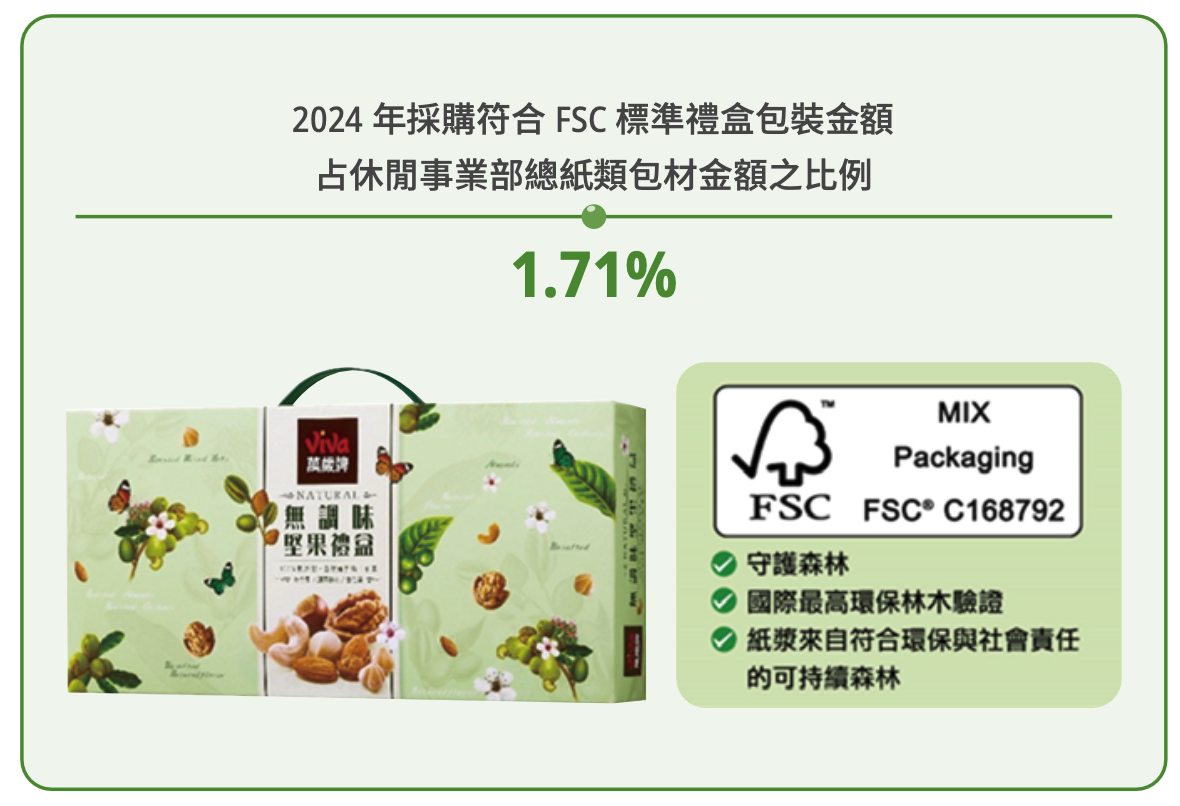 2024 年聯華食品採購符合 FSC 標準禮盒包裝金額,占休閒事業部總紙類包材採購金額 1.71%。