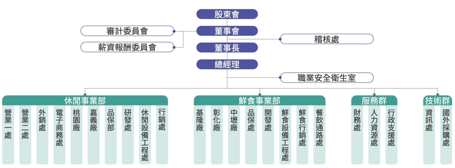 聯華食品基於對企業永續經營的承諾,為具體落實誠信經營的原則,聯華食 品於 ESG 企業用續發展委員會下設置專責公司治理議題的「公司治理小組」,由總公司財務處及行政支援處共同組成,負責企業永續經營公司治理相關規劃作業,以及依循相關規定,注重股東權益,強化董事會運作,並於 2019 年 6 月成立第一屆審計委員會,以實踐健全的公司治理。