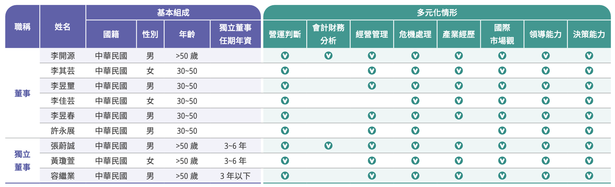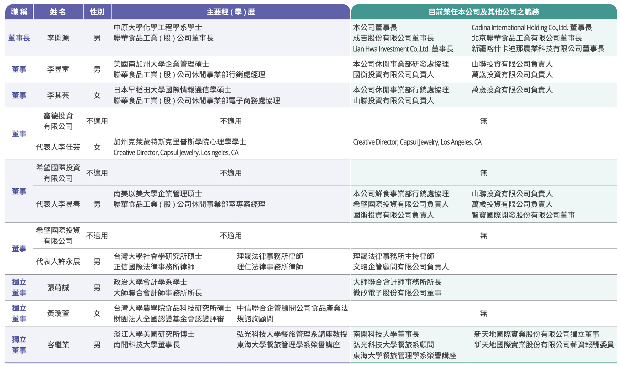 聯華食品董事會成員共 9 席,包含一般董事 6 人,獨立董事 3 人 ( 佔比 33.3%),其中 1 名獨立董事任期在 3 年以下,2 名獨立董事任期在 3~6 年。女性董事成員共 3 席 ( 佔比 33.3%),並有 1 席為獨立董事;董事年齡 50 歲以上有 4 名 ( 佔比44.4%),30~50 歲有 5 名 ( 佔比 55.6%),已兼具不同年齡層,而成員不包含弱勢社會群體。
