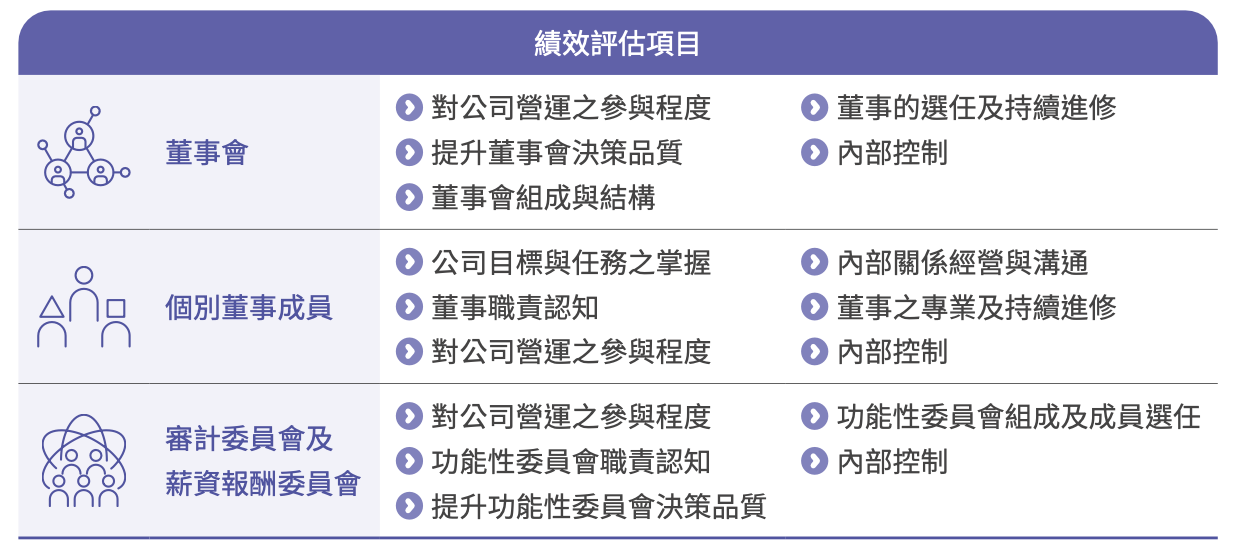 聯華食品為落實公司治理及提升整體董事會功能,於 2020 年 1 月 8日由董事會通過訂定「董事會績效評估管理辦法」; 明定每年執行一次內部董事會績效評估,評估範圍包括:整體董事會、個別董事成員及功能性委員會之績效評估,2023 年已將 ESG 面向的績效納入董事會的評估項目。評估作業採內部問卷方式進行,依董事對董事會運作評估、董事成員對自身參與運作評估、審計委員對委員會運作評估及薪資報酬委員會對委員會運作評估。執行單位依「董事會績效評估管理辦法」,將評鑑結果於次一年度第一季送董事會報告並檢討改進之。