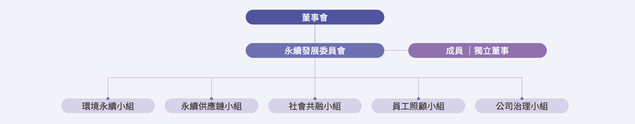 該委員會由總經理擔任主任委員,負責全公司 ESG 策略與相關決策頂目,下設副主任委員,分為五大功能群組,分別是環境永續小組、永續供應鏈小組、社會共融小組、員工照顧小組和公司治理小組,而董事會仍會定期檢視及核准永續發展相關事項。