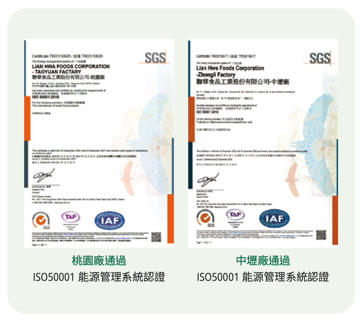 聯華食品於 2020 年間,鮮食事業部- 中壢廠通過 ISO-50001 能源管理系統認證, 2021 年起推廣至休閒- 桃園廠通過認證 ISO50001 能源管理系統,並以具體的行動方案徹底落實能源管理,透過能源管理方案對使用之能源進行質與量的管控,特別是高能耗設備進行數據採集與對數據作系統性分析,持續優化設備運轉效率、改善生產流程,達到提高能源使用效率的目的。