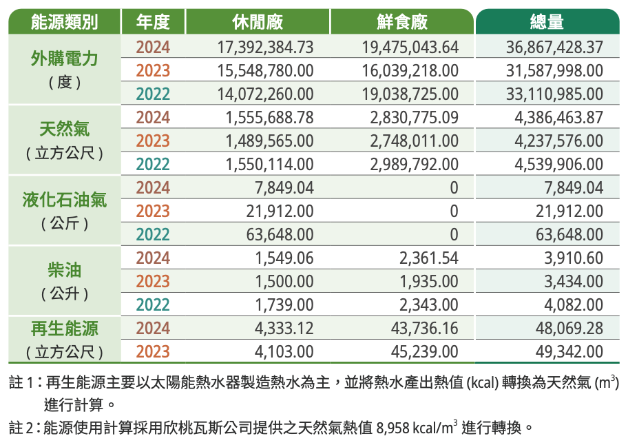 聯華食品主要使用能源為電力,外購電力占所有使用能源百分比為 44.19%,其次為天然氣 (LNG) 及液化石油氣 (LPG),其餘以柴油為輔,2024 年電力使用總量 36,867,428.37 度,較 2024 年增加 16.71%;主要原因公司整體營收成長所影響。液化石油氣 (LPG) 使用總量 7,849.04 公斤,較 2023 年減少 64.18%,天然氣 (LNG) 使用總量 4,386,463.87 方公尺,較 2023 年增加 3.51%。