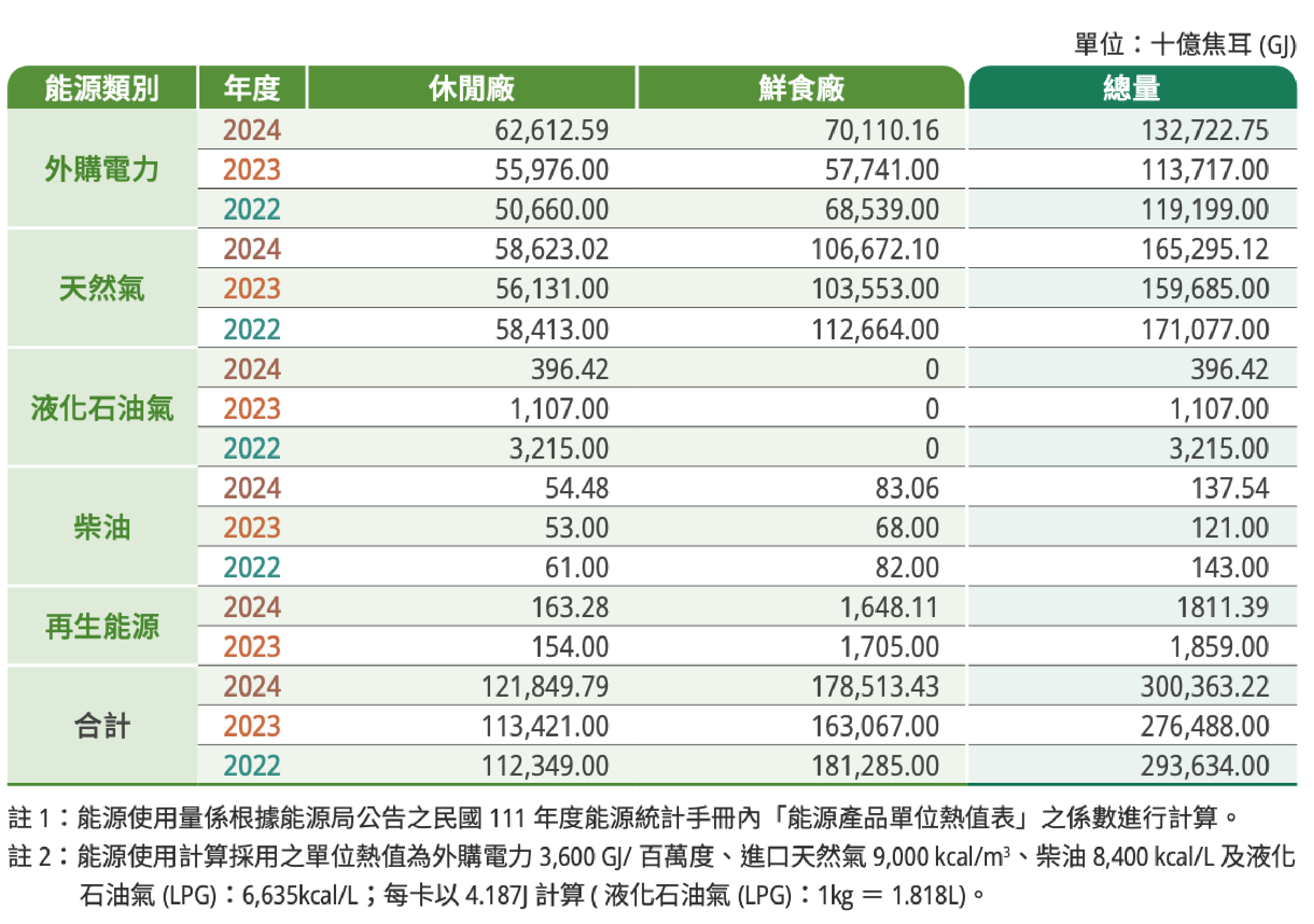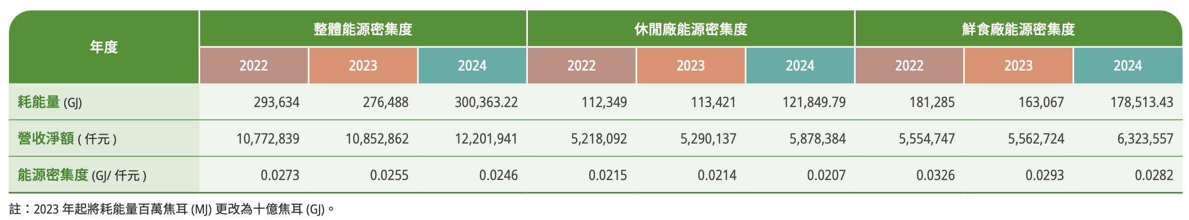 聯華食品能源密集度比值所涵蓋的能源類型,包含燃料、電力、供熱、製冷、蒸汽,計算能源密集度比值時採用組織內部的能源消耗量。2024 年聯華食品整體能源密集度為 0.0246 (GJ/ 仟元 ),較 2023 年的 0.0255 (GJ/ 仟元 ) 減少 0.0009,由此可以看出 2024 年整體能源密集度較 2023 年佳,減少的能源消耗量中所包含的能源類型包含燃料、電力、供熱、製冷、蒸汽。