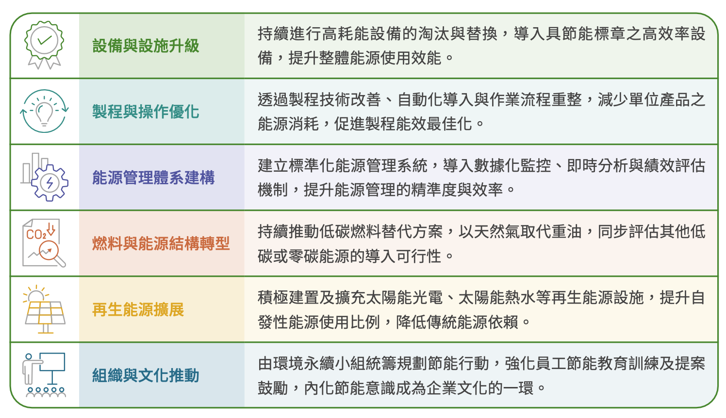 為持續推動能源效率提升與碳排放降低,聯華食品依據企業永續發展方針,系統性規劃出六大節能策略,作為全面落實節能減碳工作的推進主軸。透過設備汰換、製程改善、再生能源利用、能源管理優化、燃料結構轉型與文化內化六大面向,聯華食品致力於強化各廠區能源管理效能,確保節能目標具體達成。主要策略如下: