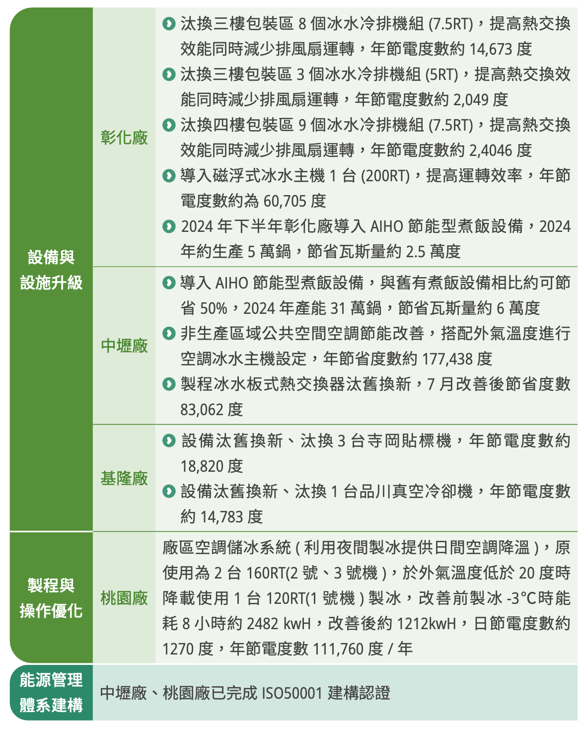 以上六大策略相互支援並持續優化,形成聯華食品推動節能減碳的完整體系,確保各項節能措施能有效落地執行,並支持公司達成永續發展與氣候韌性的長期目標。 2024 總節電 507,381 度,節電率達 1.3%。
