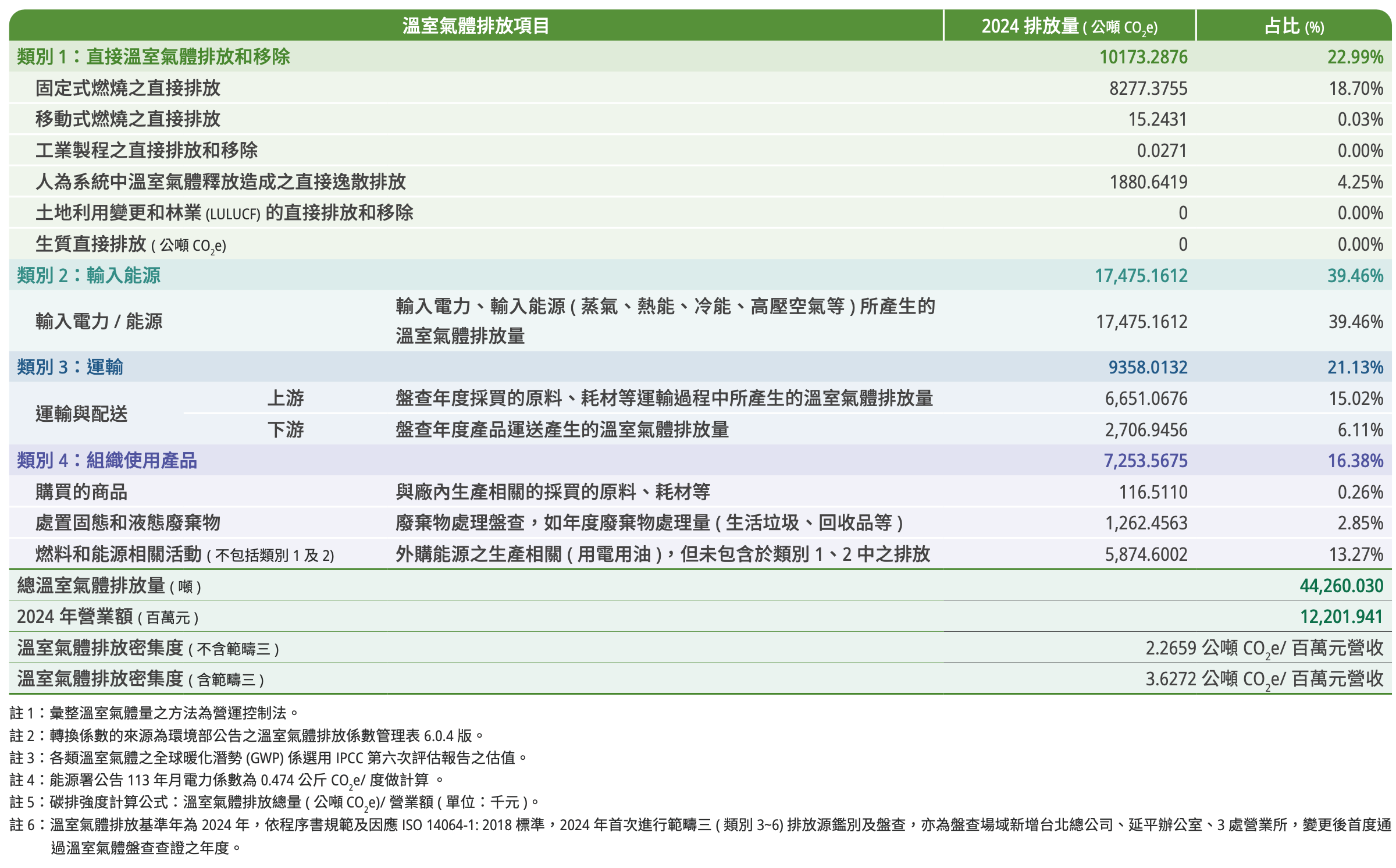 2024 年度全公司經盤查並查證之溫室氣體排放量如下:類別一排放為 10,173.2876公噸 CO2e;類別二排放 17,475.1612 公噸 CO2e;類別三排放 9358.0132 公噸 CO2e;類別四排放 7,253.5675 公噸 CO2e,共計44,260.030 公噸 CO2e。