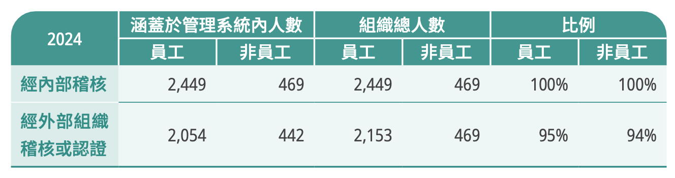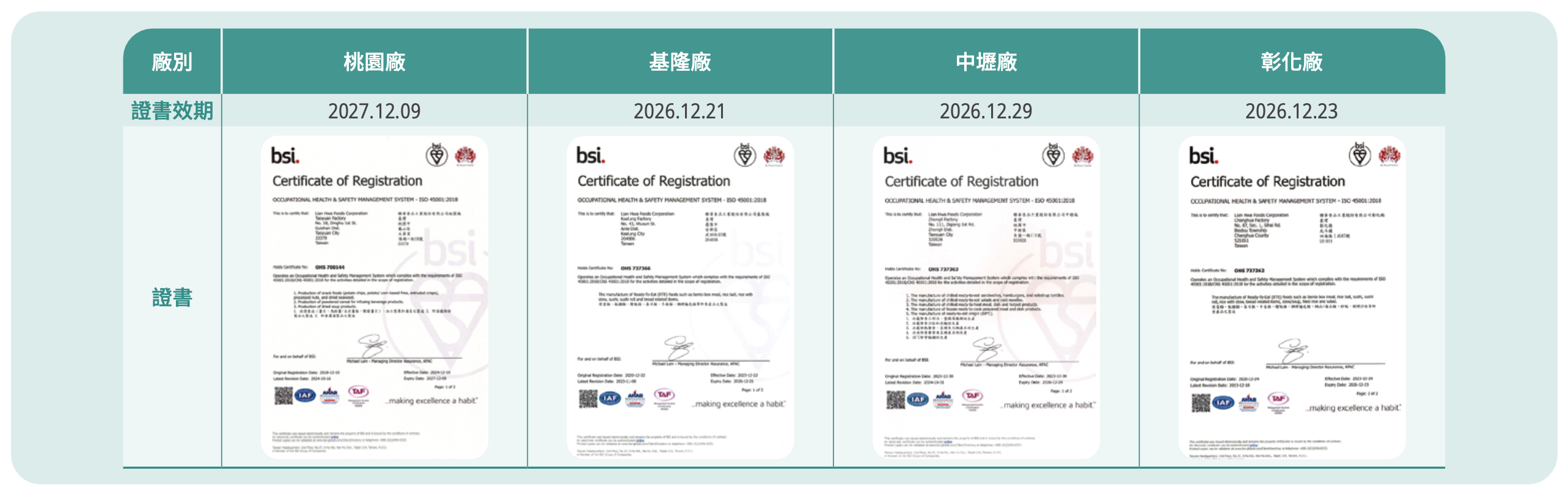 另外在職業安全衛生管理系統之推行方面,休閒事業部轄下桃園廠 2024 年 10 月,由英國標準協會 (BSI) 完成職業安全衛生管理系統 ISO45001 及 CNS45001 之換證稽核,鮮食事業部轄下基隆廠、中壢廠於 2024 年 10 月,彰化廠 2024 年 11 月,亦分別由英國標準協會 (BSI) 完成職業安全衛生管理系統 ISO45001 及 CNS45001 之追蹤稽核,其證書有效期限如下: