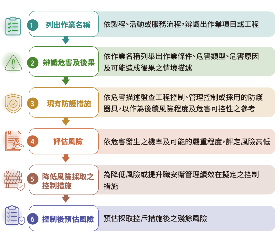聯華依職業安全衛生法及 ISO/CNS 45001 職業安全衛生管理系統相關規範之要求,建立「職安衛風險與機會行動規畫評估辨法」,辨識組織裡工作環境或作業 ( 包含製程、活動或服務 ) 內容,列舉各項可能造成工作者不健康或不安全之情境,與可能遭遇之傷害類型,包含組織控制下可能出現在事業單位及其組織控制下之人員 ( 如承攬人、供應商、訪客及其他利害相關者等 )所執行的各項作業,其評估流程如下: