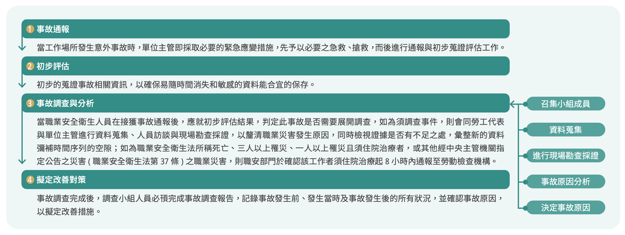 聯華依職業安全衛生法及 ISO/CNS45001 職業安全衛生管理系統相關規範之要求,建立「職安衛意外事件通報、處理及調查管理辦法」,其調查流程如下: