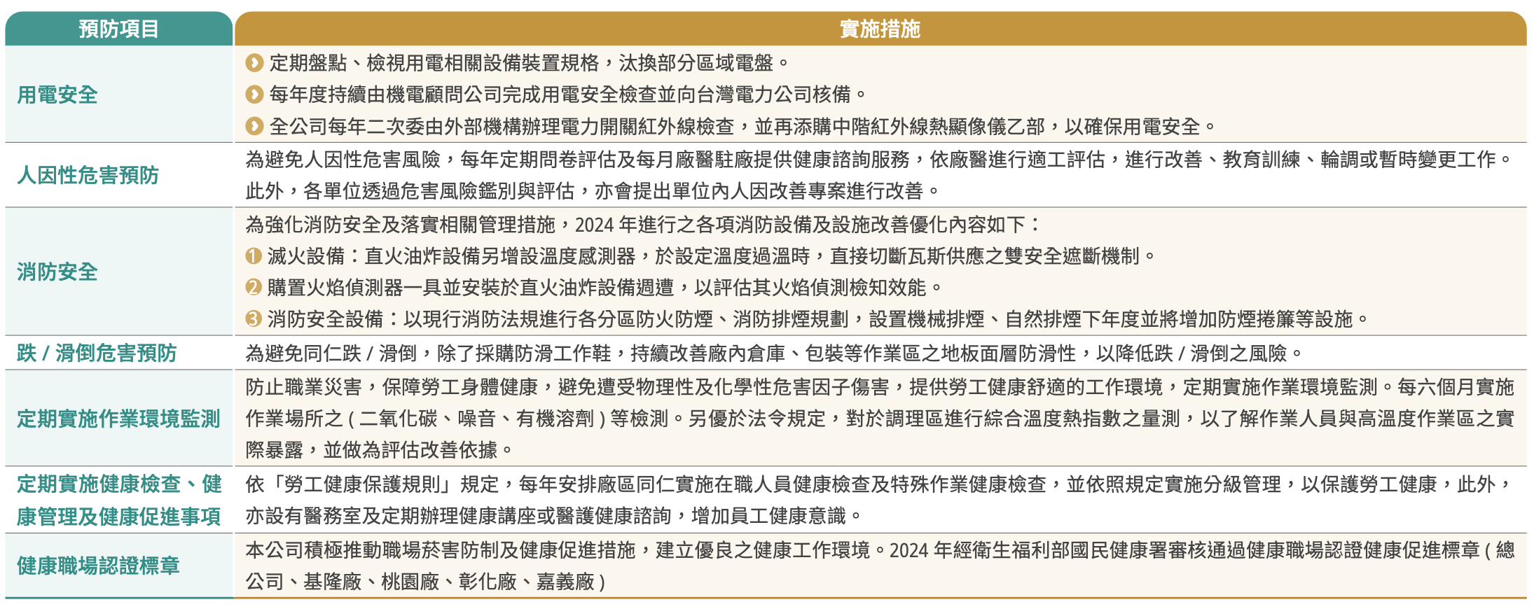 2024 年職安衛管理除持續在採購、承攬與廠商之職業安全衛生具體措施的精進與落實外,有鑑於少數廠房建築於民國 90 年以前,其消防安全規畫雖符合法令,但已不符實況所需,故結合危害鑑別風險評估、變更管理等措施,對機械、設備或器具與設施規畫等,進行提升或改善,例如持續防火防煙區劃與消防排煙增設等,具體的成果在用電、火災與肌肉骨骼傷害預防等,分別有電力元件系統汰換、瓦斯管線,皆依 PDCA 的循環模式辦理與執行。