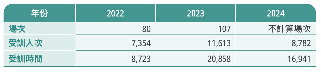 為建立職場安全文化,積極培養員工安全意識,降低作業風險,聯華食品持續規劃、辦理職業安全衛生教育訓練, 2023 年度共辦理 107 場次訓練活動,參與人次達 11,627 人,受訓時數達 31,946 小時,2024 年度辦理訓練活動參與人次達 8,782 人,總受訓時數達 16,941 小時。除依據「職業安全衛生教育訓練規則」規定辦理新進、在職人員、調換作業員工及操作危險性機械、設備,從事有害、特殊等作業之證照與教育訓練,使員工熟諳作業技能及作業上之安全衛生風險。另為避免意外及傷害事件發生,實施規劃及辦理包含職業災害案例宣導,以了解作業危害、遵守作業規範及異常狀況通報、處理…… 等內容。同時也針對健康促進另辦理血壓血糖控制、痠痛與紓壓、運動減脂及CPR+AED 等課程,以達到預防及改善職業傷病發生及健康管理之目的。